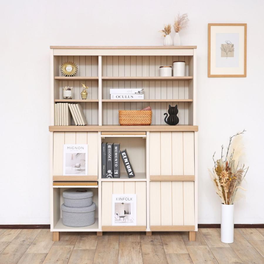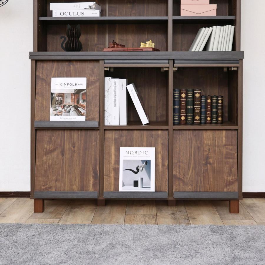 ミドルサイズ ディスプレイキャビネット シェルフ 書棚 本棚 ラック フラップ扉 幅114.5cm 日本製 組み立て式 CR-9012DP+CR-7012UP