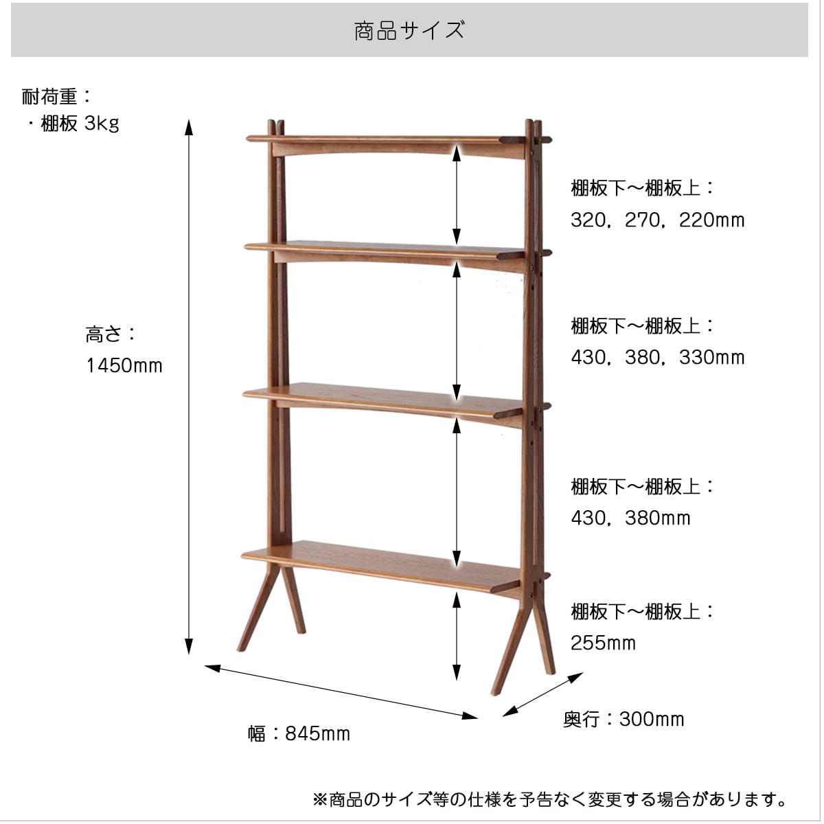 ■耐荷重:棚板1枚あたり 約3kg